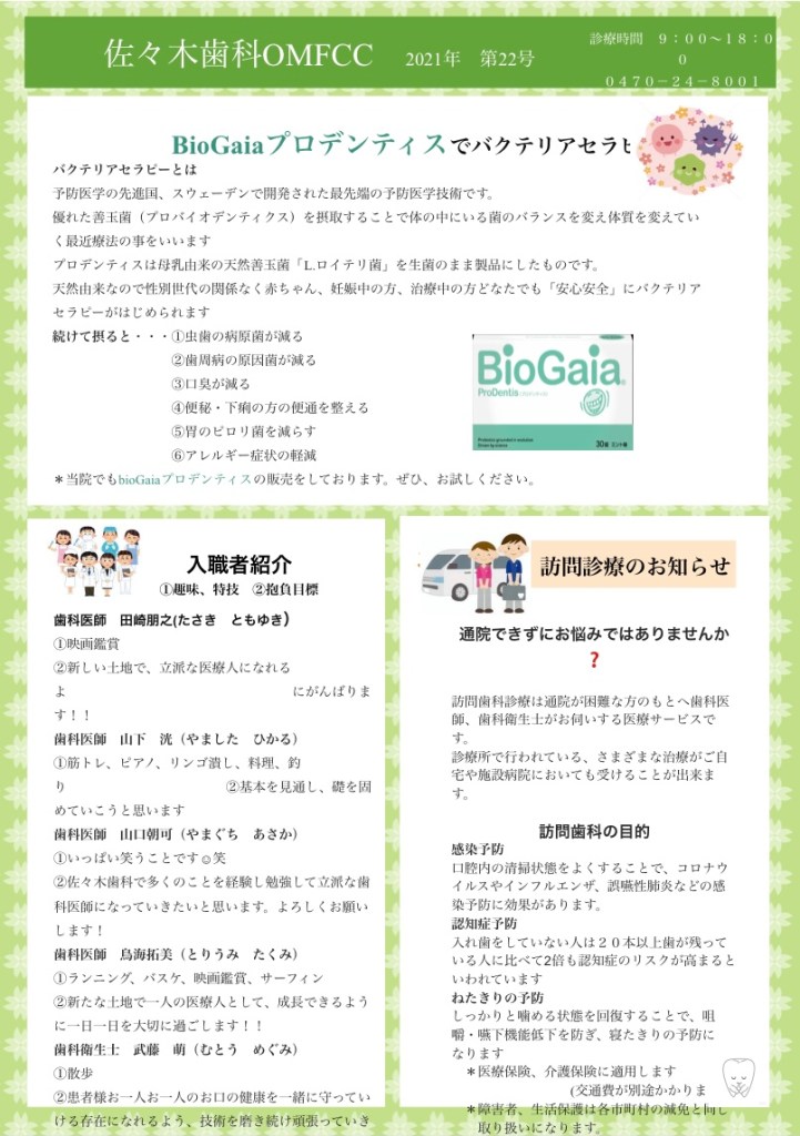 また当院の特色として、外来治療の約70%を占める歯周病治療、齲蝕治療などの一般歯科診療を行いながら、看護師、歯科衛生士、歯科技工士などと協力し、救急車で搬送されてきた口腔顎顔面外傷(2016年日本口腔顎顔面外傷学会主催)、蜂窩織炎などの急性炎症、慢性顎骨骨髄炎、歯性上顎洞炎などに対する点滴や口腔内科疾患(味覚異常、口腔乾燥症、舌痛症、口腔がん、口腔扁平苔癬、カンジダ症、口臭、ほか)診断のための採血や各種検査法を駆使し、口腔外科専門医、歯科麻酔専門医、口腔がん専門医、口腔内科専門医と恊働治療を経験できます。